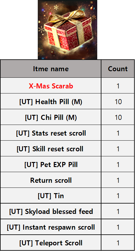 ㆍ Using a Golden Gift Box grants various items, including the X-Mas Scarab.