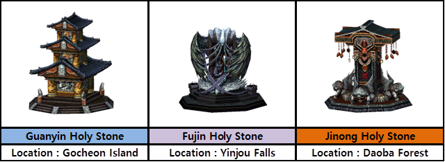 -Faction Statues are placed in (Gocheon Island, Yinjou Falls, Daoba Forest).