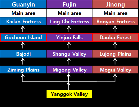 Example: Yanggok Valley → Destroy Yanggok Valley Guardian Shield → Move to Ziming Plains → Destroy Ziming Plains Guardian Shield → Move to Bajodi Flatlands → Destroy Bajodi Flatlands Guardian Shield → Move to Gocheon Island → Destroy Guanyin Faction Statue