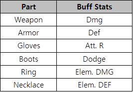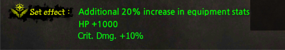 Example) Weapon: +20  / Rest of parts: +40 triggers the ‘+20 set effect’ (2% additional equipment stats and +100 health)