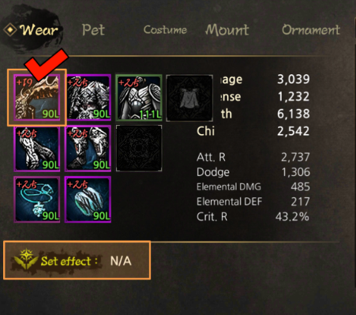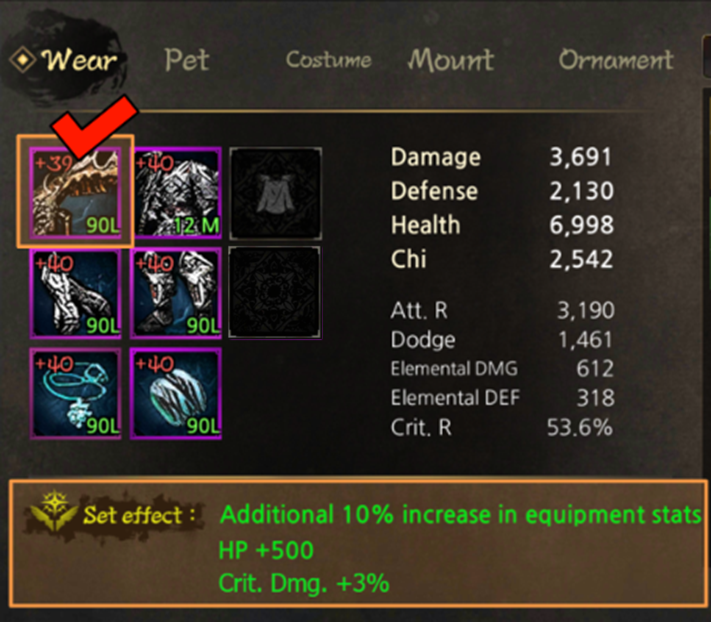 Example) Weapon: +39  / Rest of parts: +40 triggers the ‘+35 set effect’ (10% additional equipment stats and +500 health, Crit. Dmg. +3%)