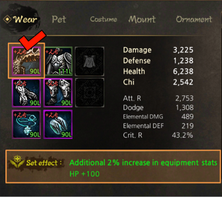Example) Weapon: +25  / Rest of parts: +25 triggers the ‘+20 set effect’ (2% additional equipment stats and +100 health)
